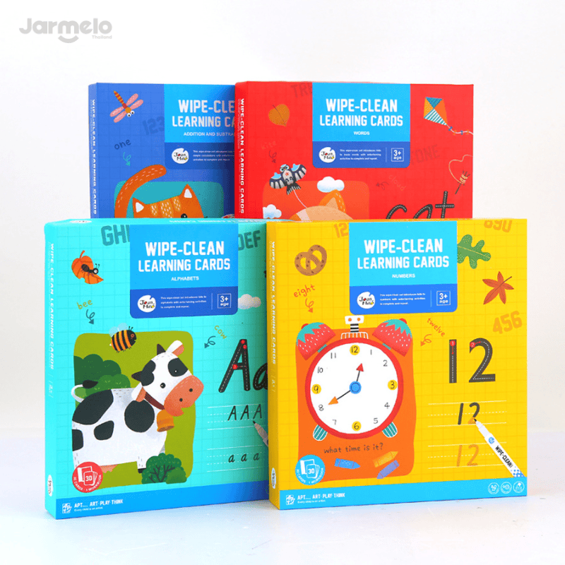 ชุดการ์ดเรียนรู้ลบเขียนลบได้ประกอบด้วยการ์ดสีสันสดใสที่มีภาพประกอบน่ารักและตัวเลข เพื่อช่วยเสริมสร้างทักษะการเขียนและการเรียนรู้ของเด็ก.