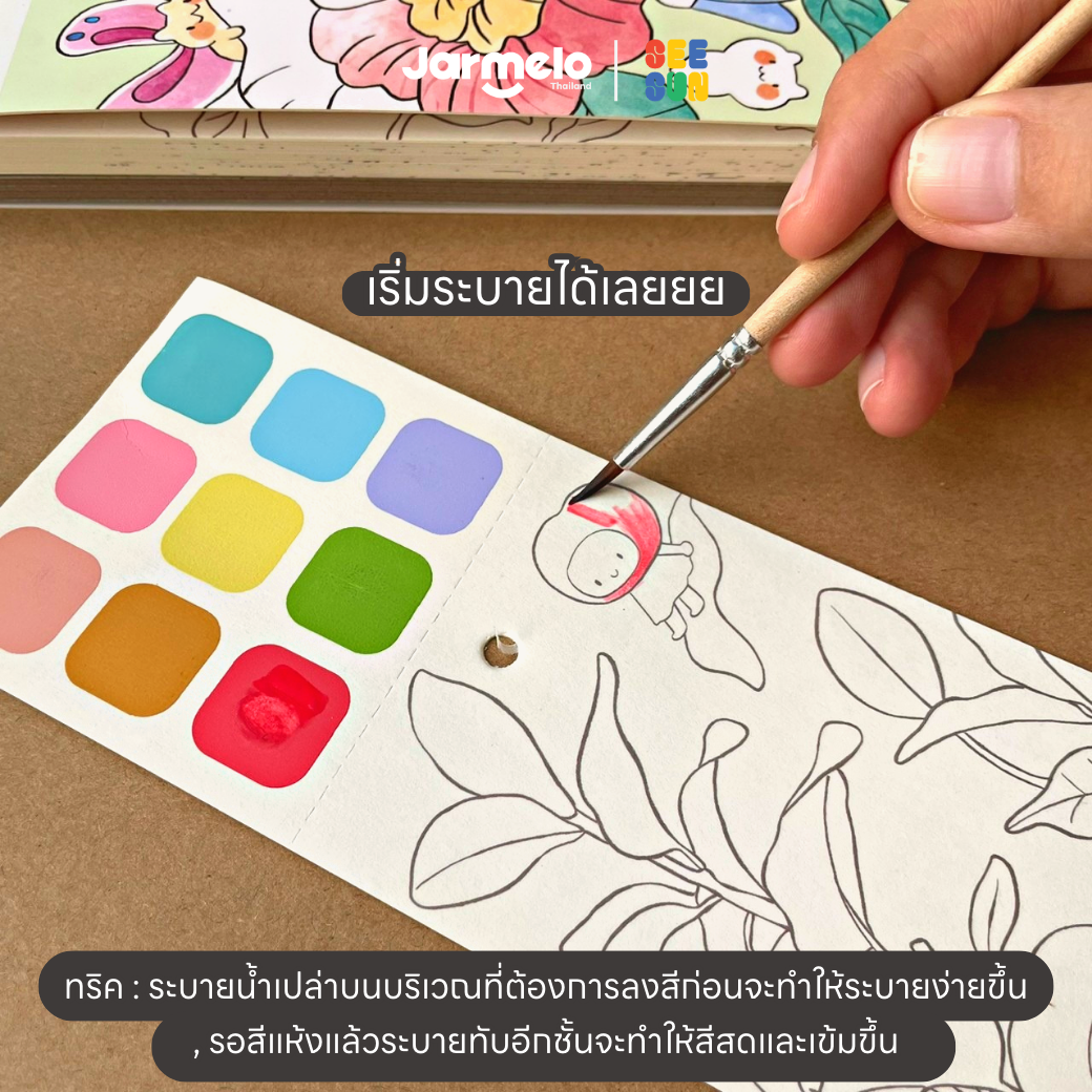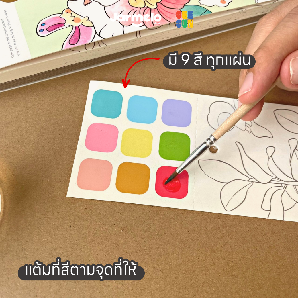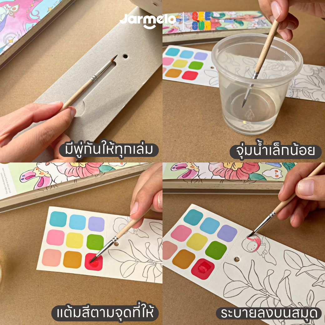 ✅ สีแห้งไว ไม่ต้องกลัวเลอะเทอะ มีช่องเก็บพู่กันให้ท้ายเล่ม
