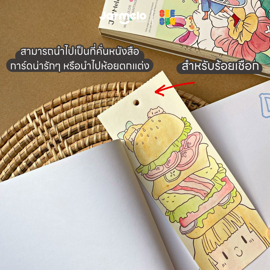 🖌 เมื่อระบายเสร็จสามารถนำมาทำเป็นที่คั้นหนังสือ การ์ดข้อความ หรือใช้แขวนตกแต่ง โดยทุกแผ่นเจาะรูไว้สำหรับใช้ร้อยเชือกได้